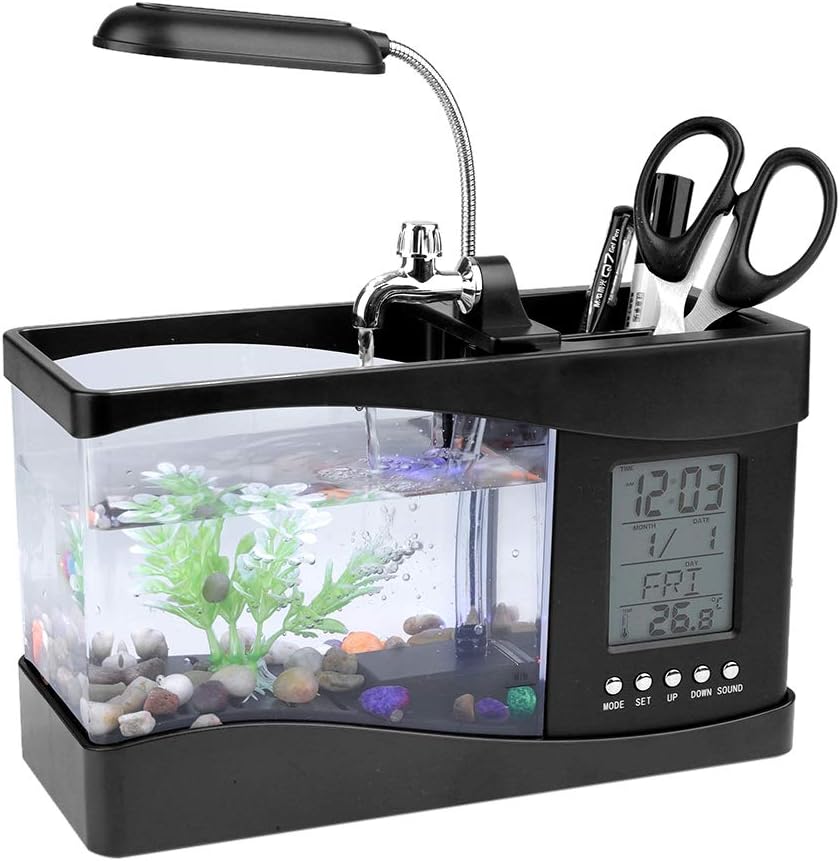 Description: This is a multifunctional fish tank. With LCD digital display, you can see the time, date, and temperature clearly. Comes with colorful LED light, great lighting for the aquarium. Comes with a small drawer at the bottom and a clear pen container, so you can store some small animals such as keys and pens. Great aquarium for living room, bedroom and office etc. Come on and grab one and you'll love it!! ! Features: Made of high quality plastic material, safe and durable. Elegant color and stylish design make it a great decoration. Comes with colorful LED light, great lighting for the aquarium. Specification: Condition: New Color: Black/White (Optional) Material: Plastic Recharge: 3 x 5V AA/USB batteries (batteries not included) Size: 26.5 x 12.5 x 14cm/10.43 x 4.92 x 5.51 inches (approx) Package Included: 1 x Fish Tank 1 x Aquarium LED Light 2 x USB Cable 1 x Small Stones Bag 1 x Water Tube 1 x Simulation Aquatic Plants 2 x User Manual (Chinese English) Notice: Please allow 1-3cm error due to manual measurement and make sure you do not mind before ordering. Please understand that colors may exist chromatic aberration as the different positioning of the pictures. Do not open the water pump if the water does not reach the safety line.